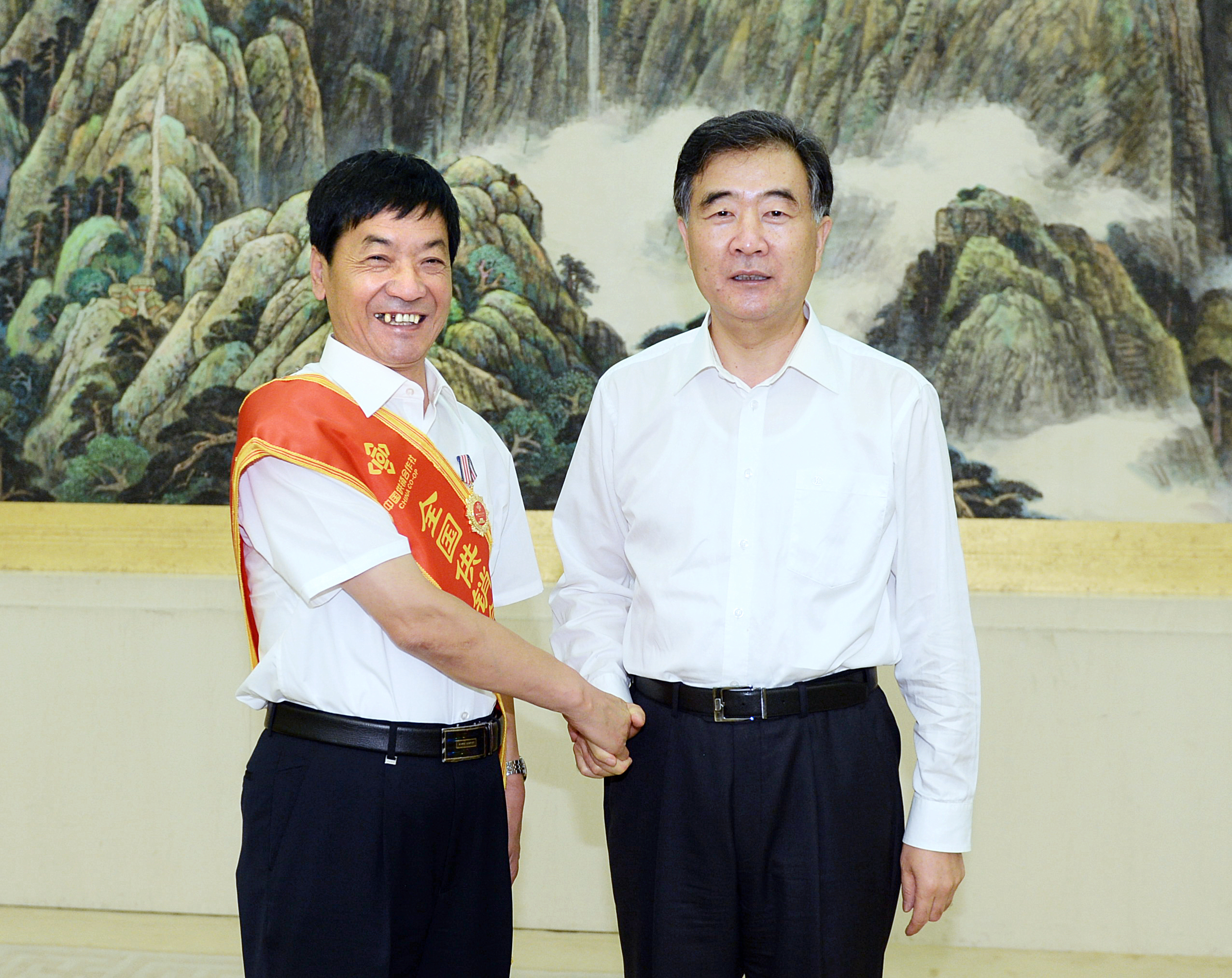 2014年7月,时任国务院副总理汪洋(右)与全国供销系统劳模张明握手