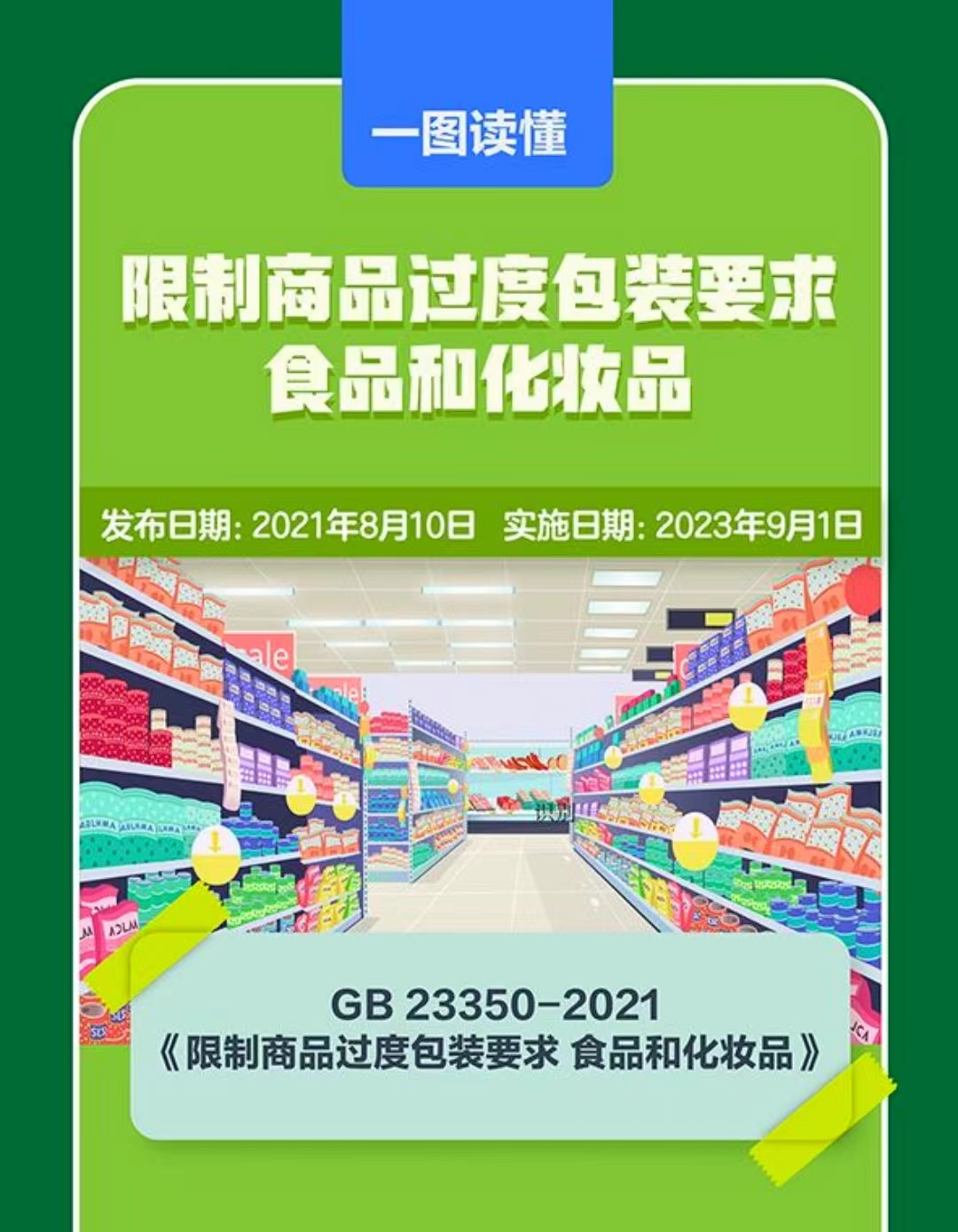 23350-2021《限制商品过度包装要求 食品和化妆品》强制性国家标准,并将于2023年9月起正式实施。