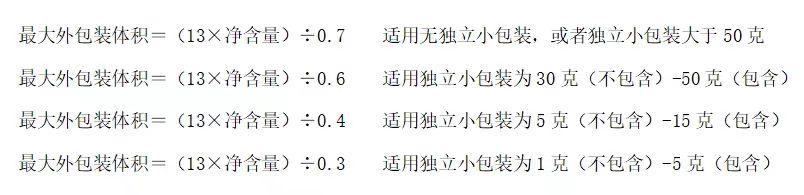 当一个茶叶产品的总净含量和内含所有独立小包装的净含量确定时,可以通过包装空隙率的计算公式和包装空隙率的要求得到该产品允许的最大外包装体积。将产品实际外包装体积与允许的最大外包装体积进行比较,若小于等于允许的最大外包装体积,则该产品包装空隙率合格;若大于允许的最大外包装体积,则该产品包装空隙率不合格。