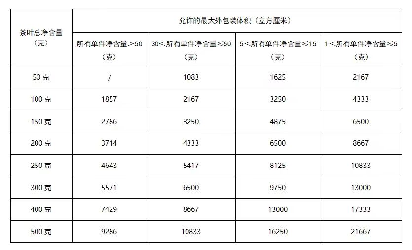 根据上述空隙率简易判定规则,我们对于茶叶常见净含量的包装计算出了允许的最大外包装体积,具体见下表(以厘米计),便于企业和消费者快速查阅判断。