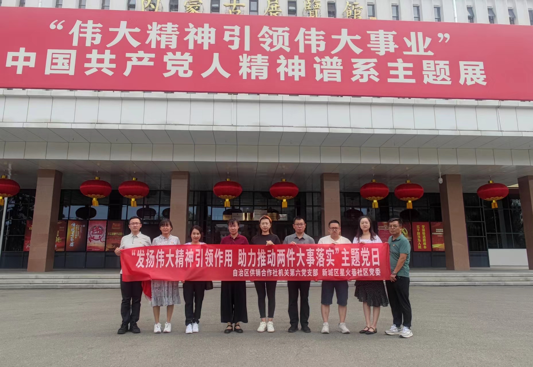 为大力弘扬以伟大建党精神为源头的中国共产党人精神谱系,推进学习贯彻习近平新时代中国特色社会主义思想主题教育走深走实,结合自治区党委直属机关工委《自治区直属机关基层党组织推动落实五大任务和全方位建设“模范自治区”实施方案》“五个一”活动要求,7月20日下午,自治区供销合作社(以下简称“区社”)机关第六党支部与包联社区——星火巷社区党委开展结对共建,以“发扬伟大精神引领作用 助力推动两件大事落实”为主题,赴内蒙古展览馆开展参观“伟大精神引领伟大事业”——中国共产党人精神谱系主题展主题党日活动。区社党组成员、理事会副主任金朝霞以普通党员身份参加活动。