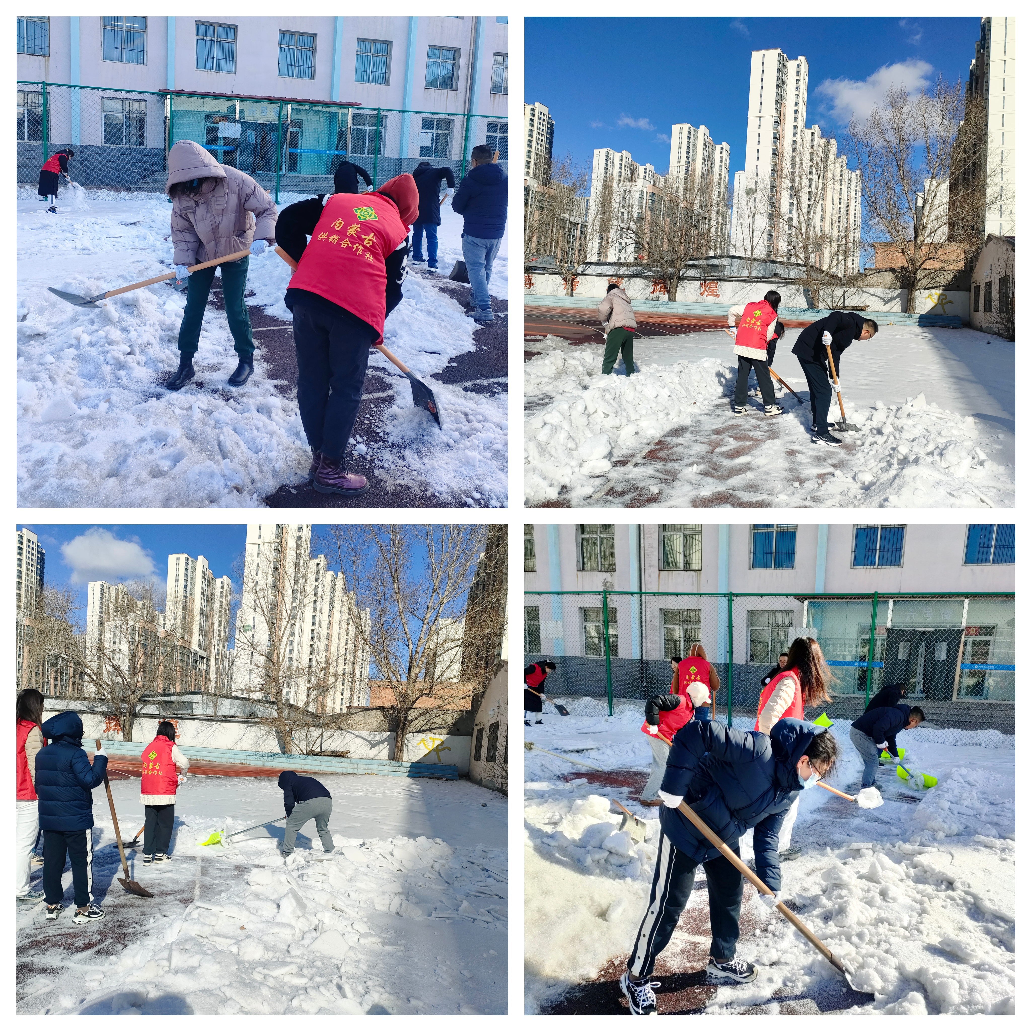 由于寒假期间连续多场降雪,区社直属的内蒙古经贸学校操场背阴面堆积了厚厚一层积雪急需清理,区社机关从立足本职服务基层、服务企业、服务群众的角度,以开展学雷锋志愿服务活动为契机,及时对接经贸学校组织开展清除积雪志愿服务。清雪活动中,区社机关党员干部以身作则,带头发扬“奉献、友爱、互助、进步”的志愿服务精神,拿着铁锹铲除坚冰、挥动扫帚清扫积雪,学生团员们也纷纷付诸行动,推来垃圾清运车及时清运积雪,打扫“战场”!通过全体志愿者齐心协力,积雪覆盖的操场不一会儿就恢复了原貌,大家用不怕苦、不怕累的实际行动践行了雷锋精神、展现了新时代供销合作社人的精神风貌。