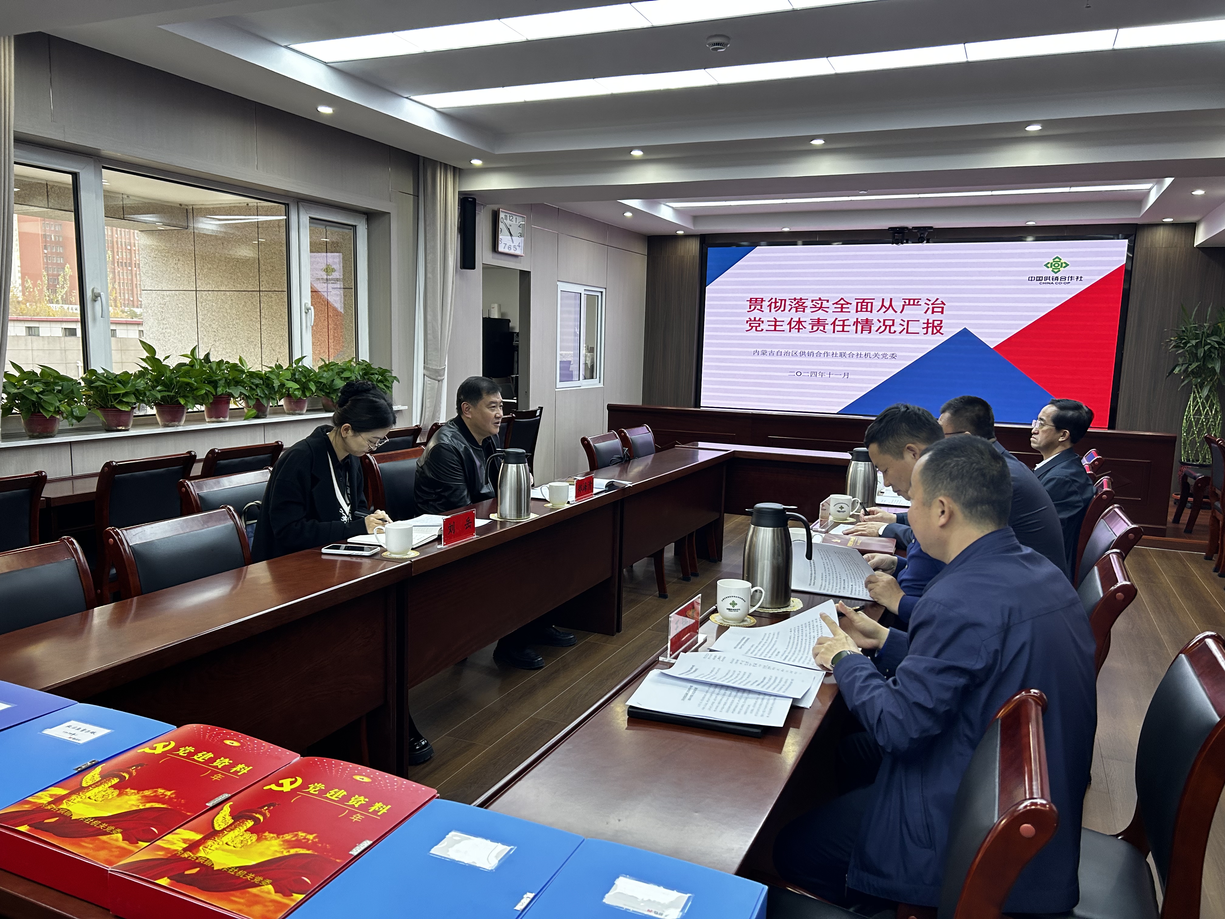 11月6日下午,自治区党委直属机关工委工会工委主任郑海清一行到自治区供销合作社(以下简称区社)对贯彻落实全面从严治党主体责任情况进行调研。区社机关党委全体人员、党支部书记代表参加座谈。